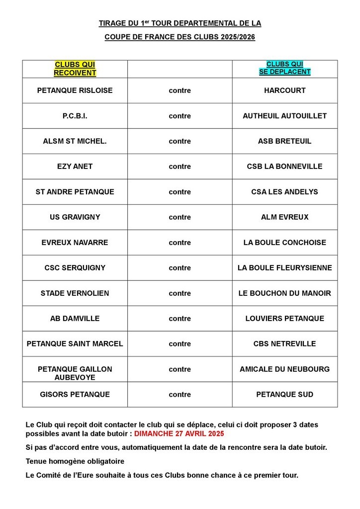- Le Président du Club qui reçoit doit appeler le Président du Club qui se déplace afin de trouver une date qui mettra les 2 clubs d'accord pour la rencontre.